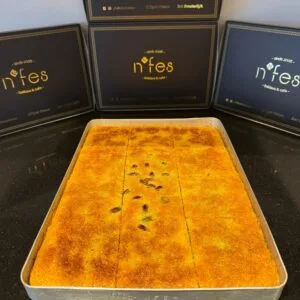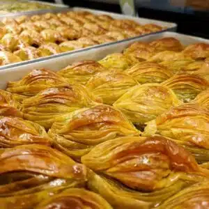 Huisgemaakte ambachtelijke Baklava rolletjes gevuld met kokos. Baklava bestaat uit flinterdunne laagjes deeg met daar tussenin een smeuïge massa van nootjes, overgoten met suikerstroop.