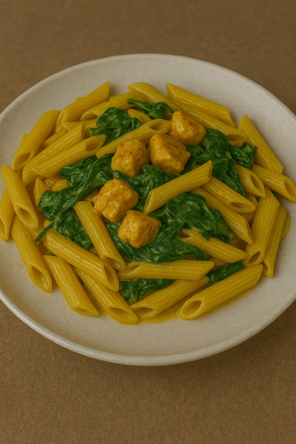 Pasta met kerrie, kip, spinazie, room.