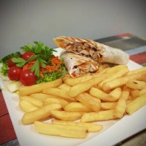 Geserveerd met friet, saus en salade.