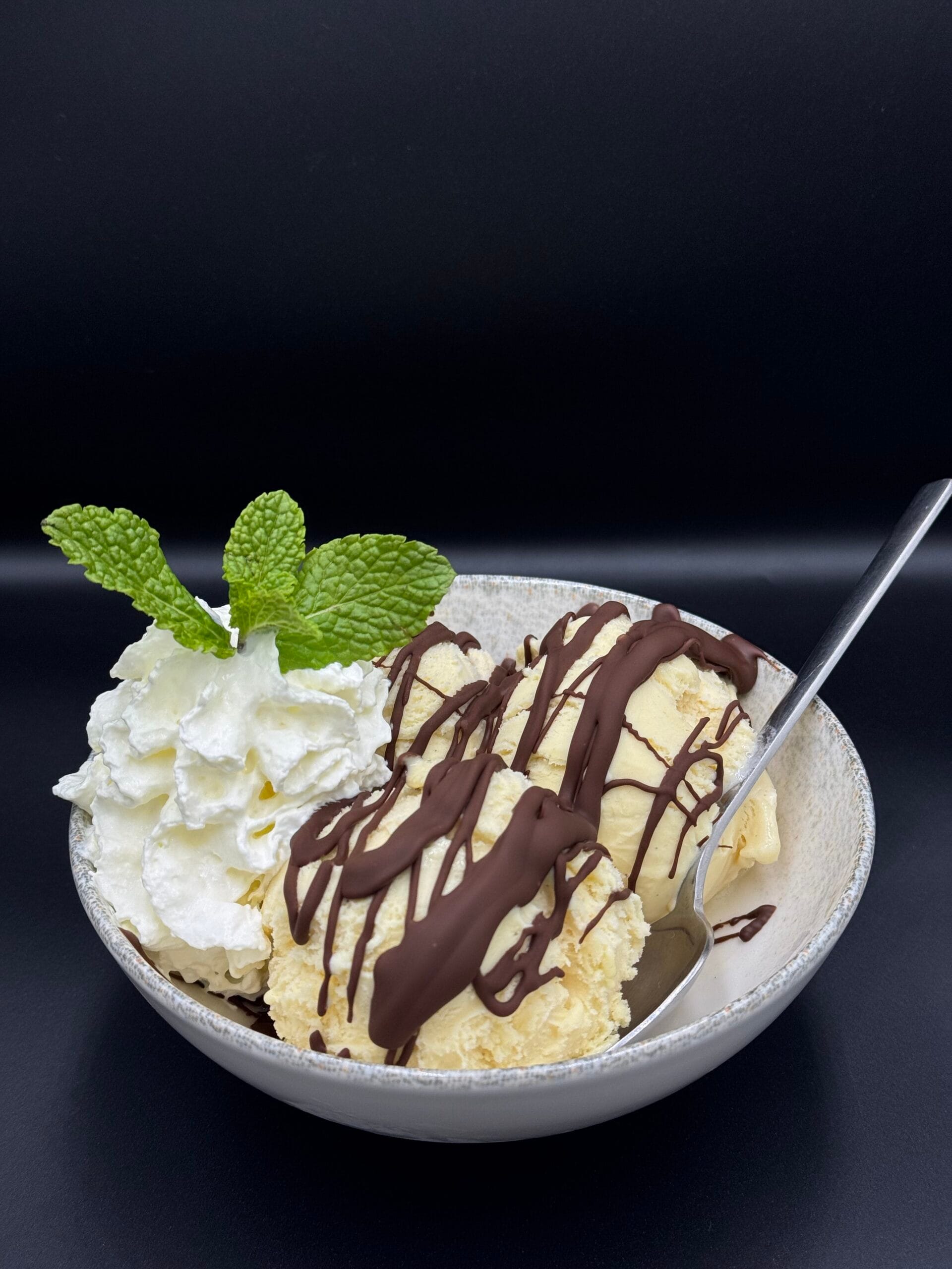 Nagerecht met vanilleroomijs en chocoladesaus, geserveerd met slagroom