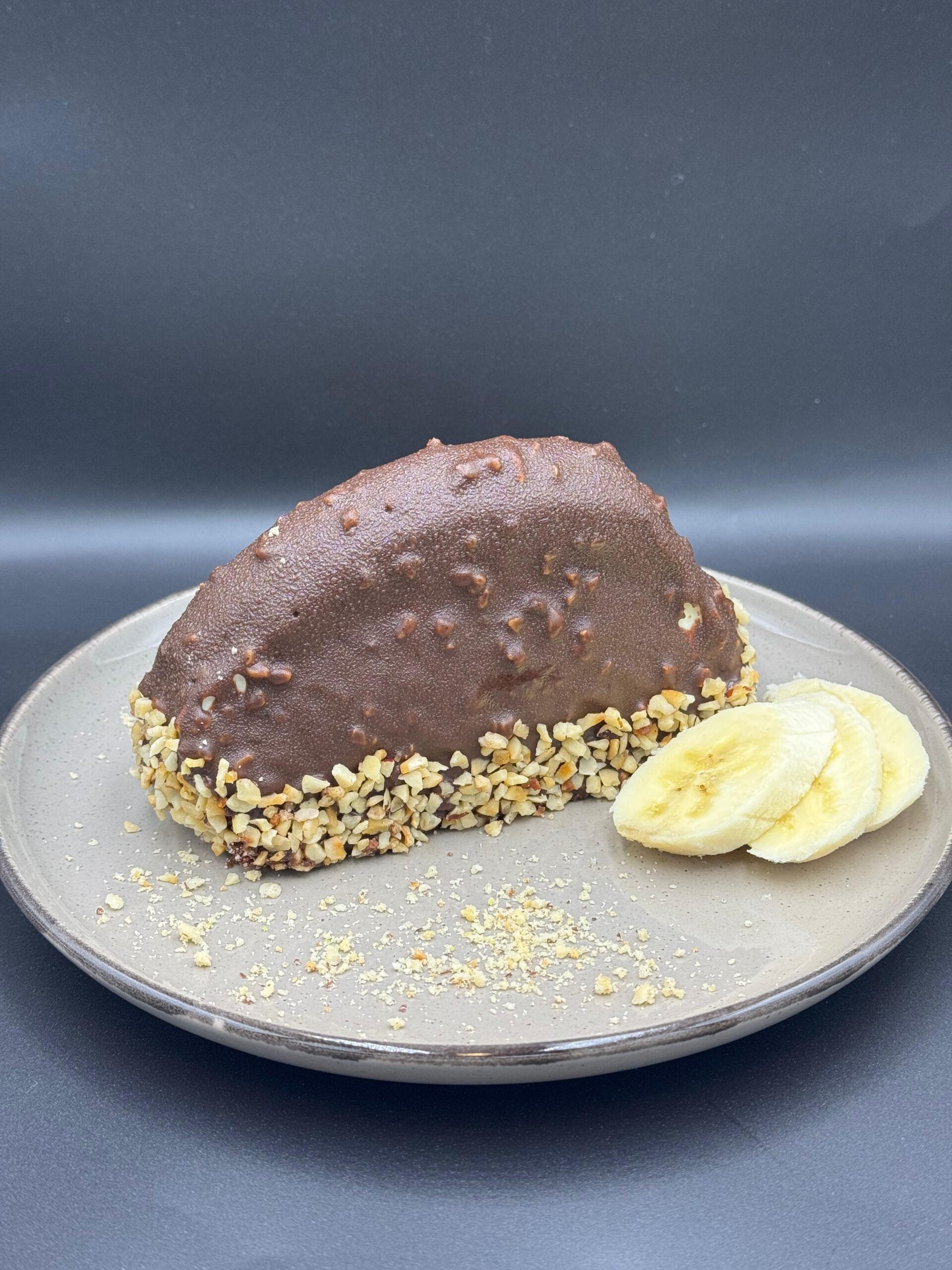 Een smeuïge Malaga-cake gevuld met romige pudding, volledig omhuld door een laag knapperige chocolade en rijkelijk bestrooid met knapperige nootjes. Afgewerkt met verse banaan voor een frisse toets. Een perfecte combinatie van zacht, romig en krokant die elke hap onweerstaanbaar maakt.